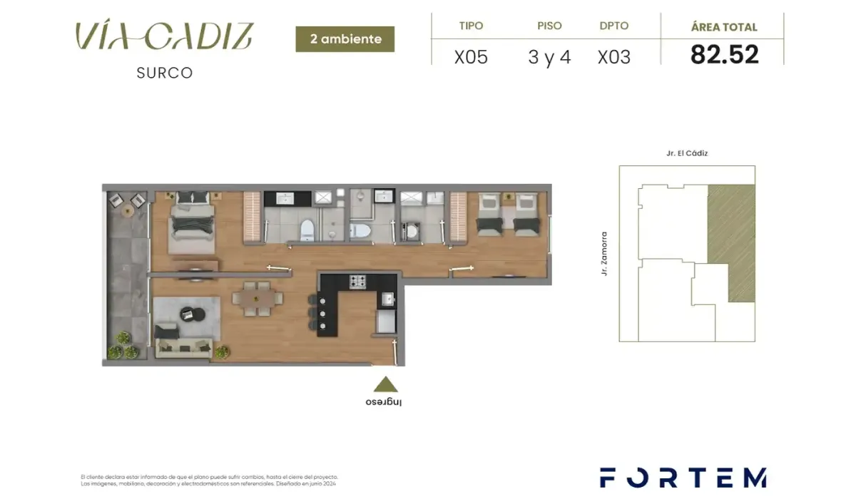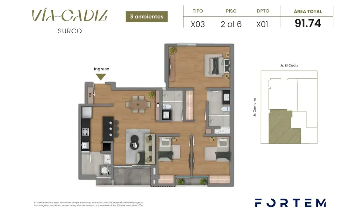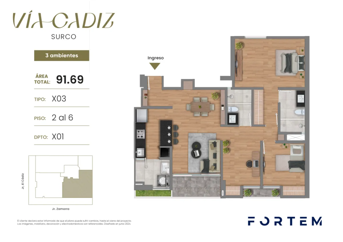 Todas las imágenes, planos, medidas y áreas son referenciales por lo que podrían sufrir cambios al momento de desarrollarse el proyecto. Los elementos decorativos son propuestas del departamento que no se incluyen en la oferta comercial y no comprometen a la empresa inmobiliaria.